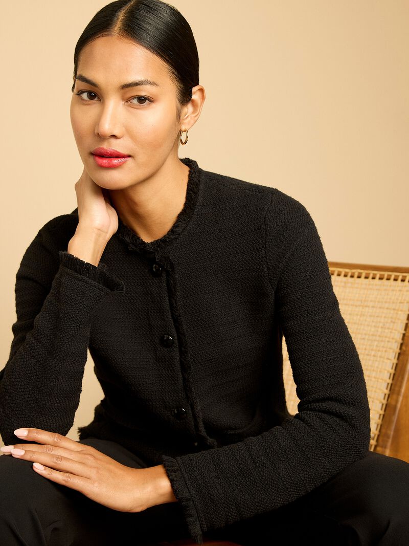 An ICO(NIC) NIC+ZOE style, the Fringe Mix Jacket, reimagined front patch pockets and a full button front. Features everything that makes the original Fringe Mix one of the greatest hits, including the fringe hem detailing and the combination of a smart, sleek silhouette with a super soft knit construction. Just as comfy as your favorite cardi, but with a little extra sophistication.