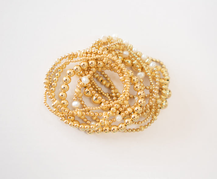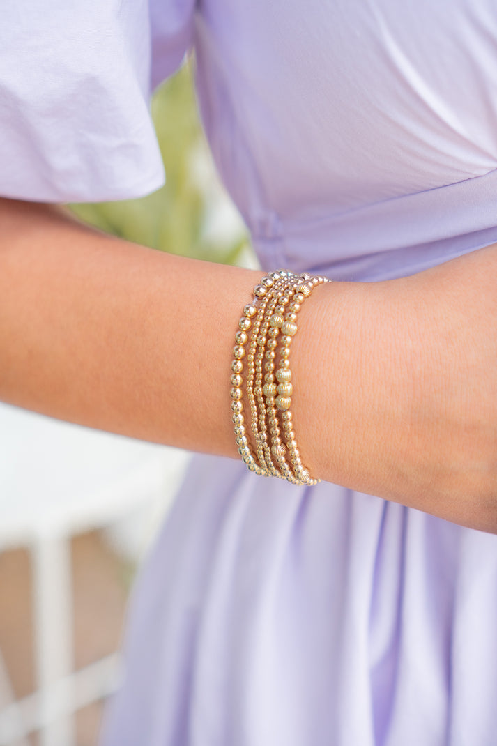 14k gold filled bracelets by Coastal Grit designed with 3mm beads on high performance string. Measures an extended size of 7.25"