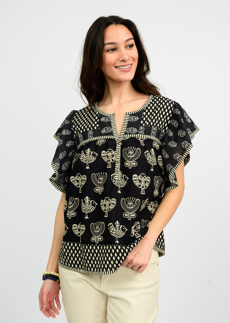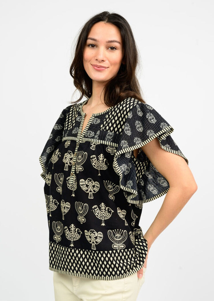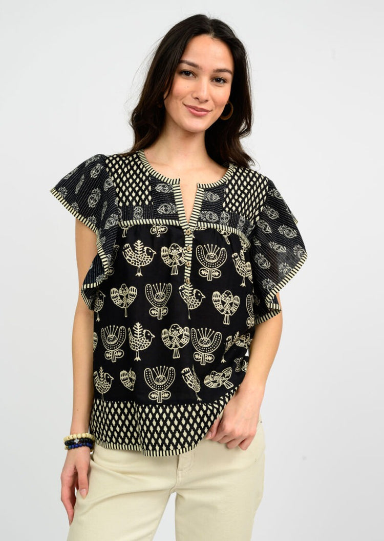 Crafted by Ivy Jane, the Patched Patterns Top in black features a delicate bird design that adds subtle charm. Its short ruffled sleeves and flattering V-neck create a refined silhouette, perfect for elevating your everyday wardrobe with expert style and comfort.