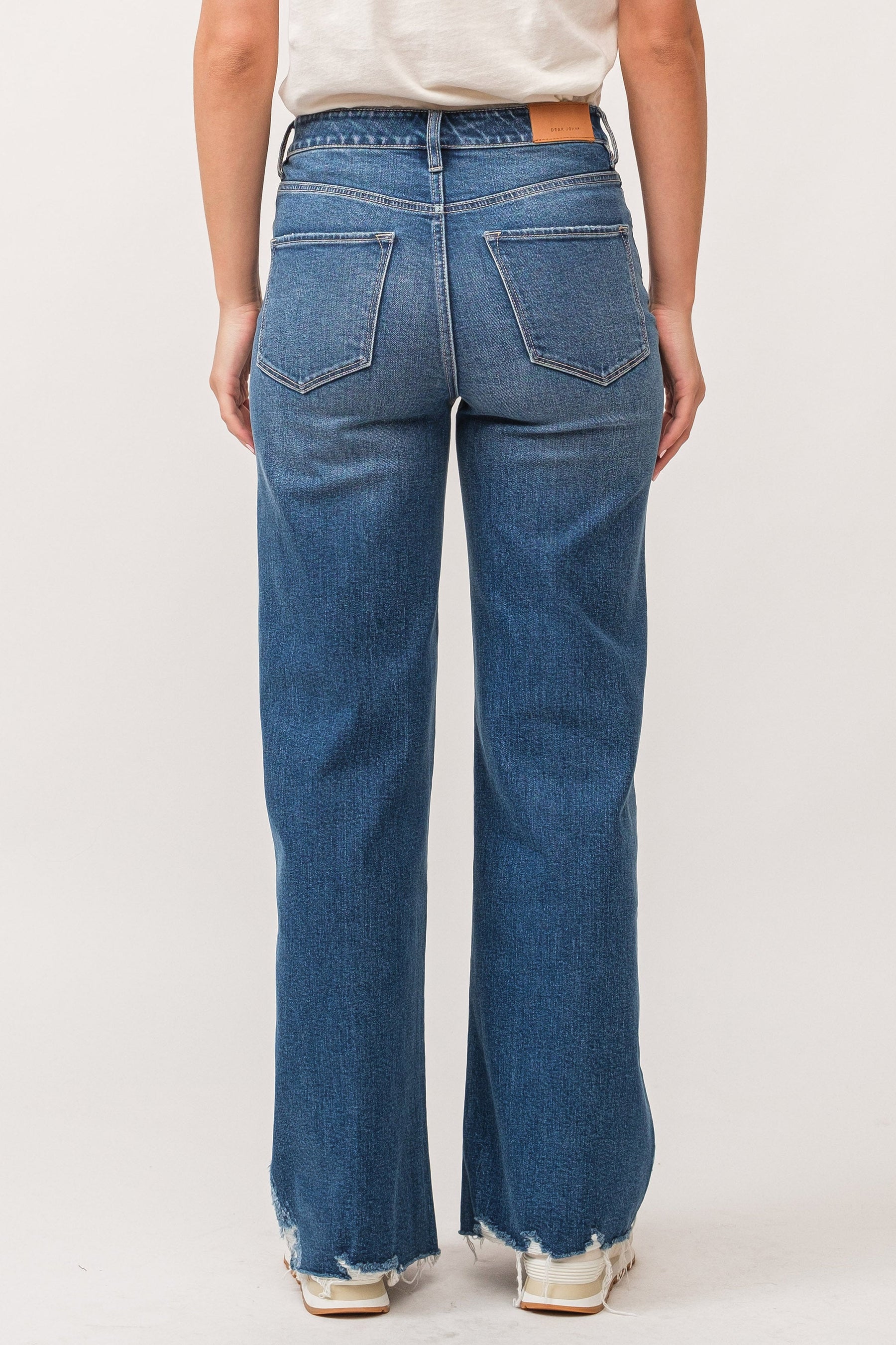 High rise wide leg jeans. It's cozy fit that sits at natural waist, embraces your natural curves and accentuates your hips and thigh. Full inseam on comfort stretch denim accented with hand sanding hip whiskers, tailor pressed seam lines, pocket grinding, side seam destructions, cut-off hem & frayed details.