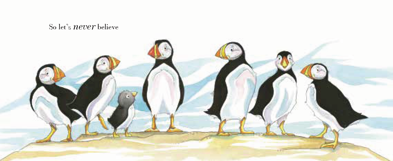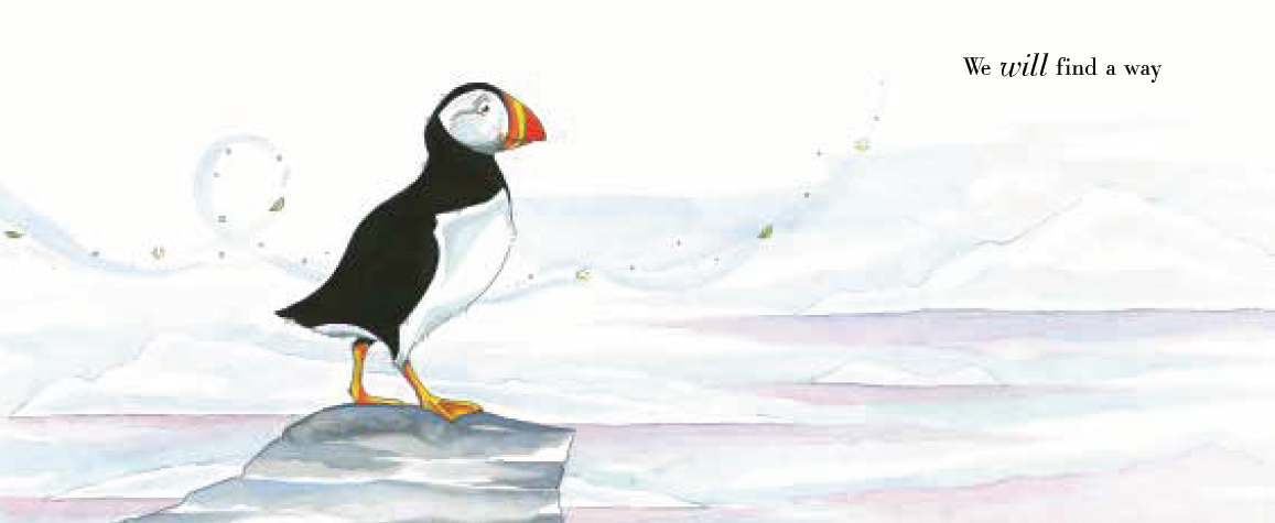 When read from left to right, the problem seems much too big to be solved by the very small puffins. But when the book is turned around and read from right to left, the puffins realize there is no obstacle that can't be moved if they all work together.
