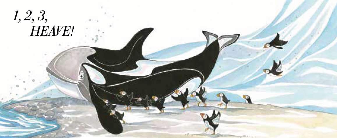 A whale is stranded on the beach, but the tiny puffins are far too small to help. Or are they?