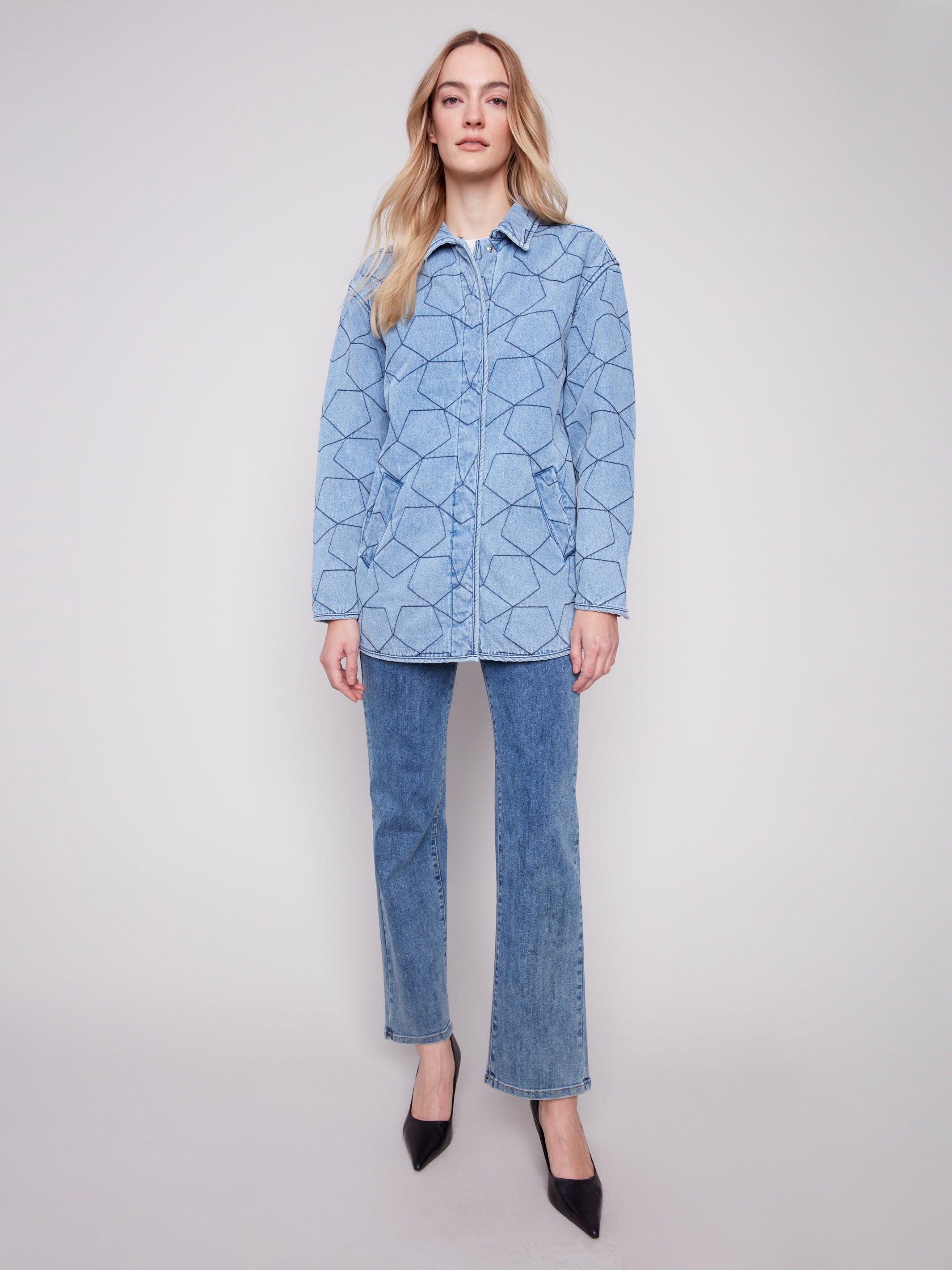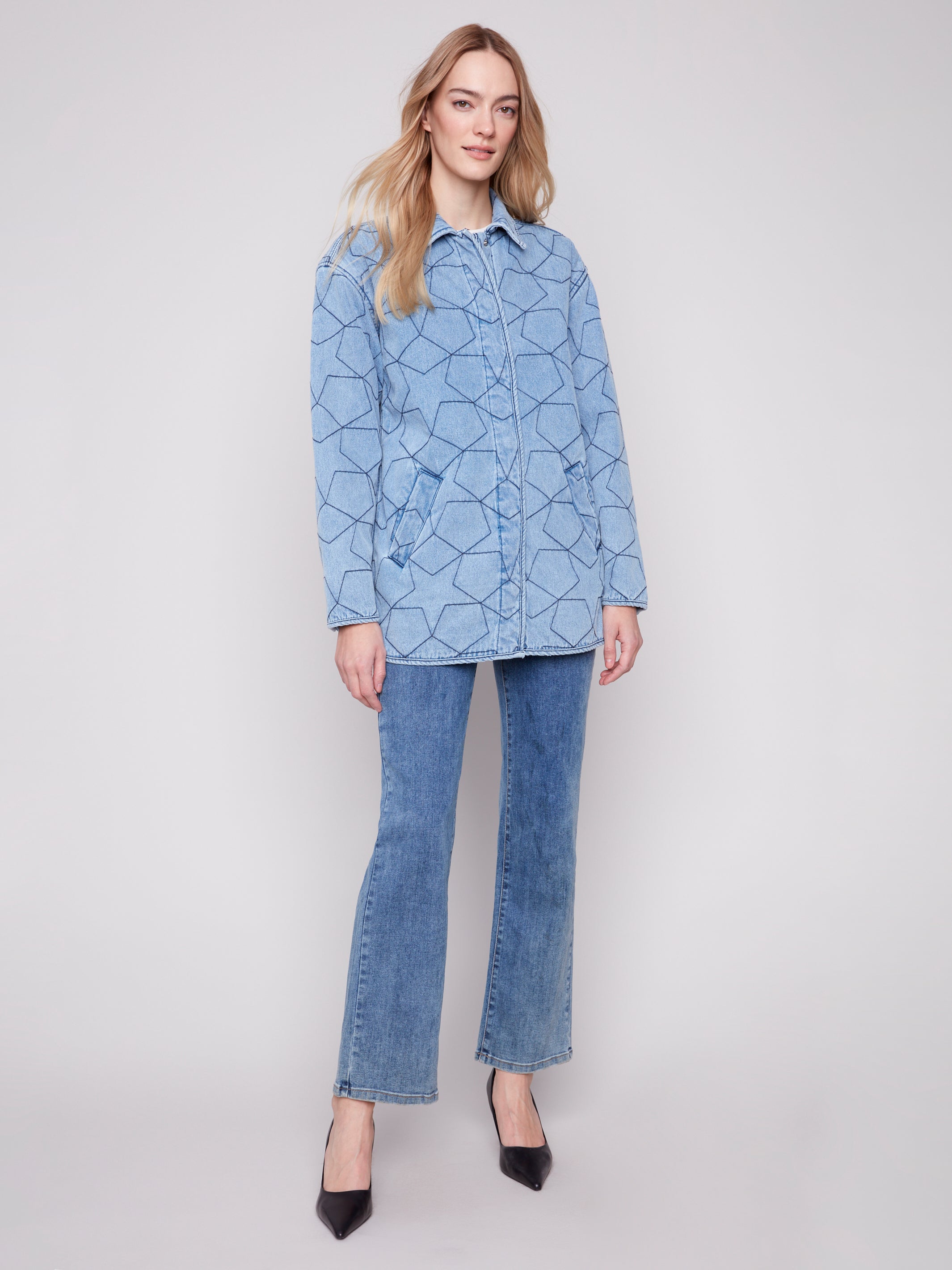 Add a touch of cosmic charm to your wardrobe with this Star Quilted Denim Jacket. Featuring playful star-shaped quilting, handy welt pockets, and sleek hidden front buttons, it’s perfect for layering with a twist. The collared design and buttoned arm cuffs add a dash of classic cool, making it your go-to jacket for fun, casual days.