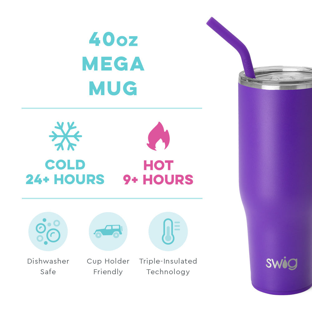 Hydrating has never been easier with our 40oz Insulated Mega Mug! A cup holder-friendly frame, a comfort-grip handle, and a plastic straw with a silicone flexi-tip all come together to create your new favorite Swig.