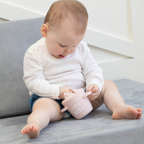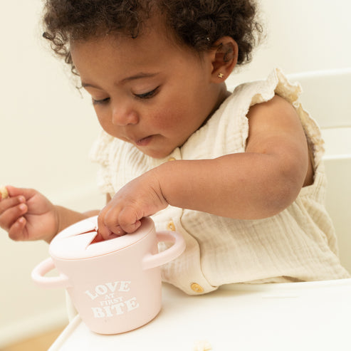 The Happy Snacker is a first-of-its-kind two-piece silicone snack cup with a mess-proof snap-tight lid and soft silicone opening so little hands can easily access food and prevent spills. Designed with easy-grip handles, it fits in car seats and stroller cup holders.