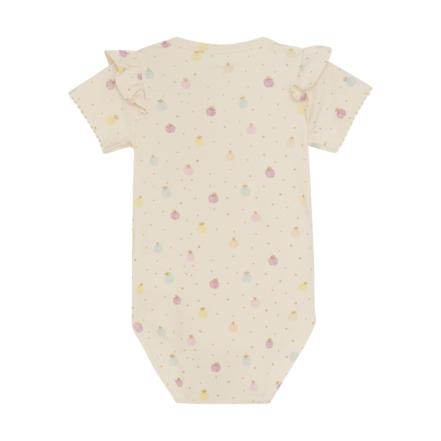 Get your little one in the sweetest summer style with the Minymo Pastel Fruit Onesie. Featuring pastel apples and golden dots on a cream background, this cute onesie also has a playful ruffle detail. Perfect for sunny days and fruity fun!