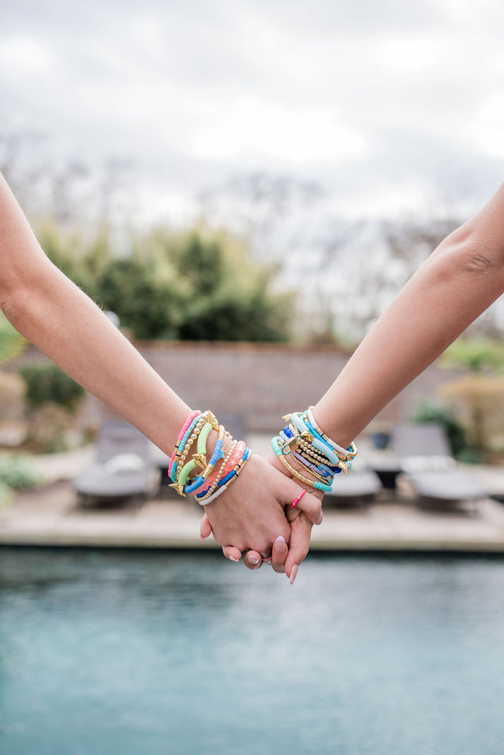 Create an arm party with these fun, colorful resort bracelets!  Stand out for game day in your favorite team colors or mix and match for a sunny day at the beach! Available in 4mm heishi beads accented with gold plated flat discs.