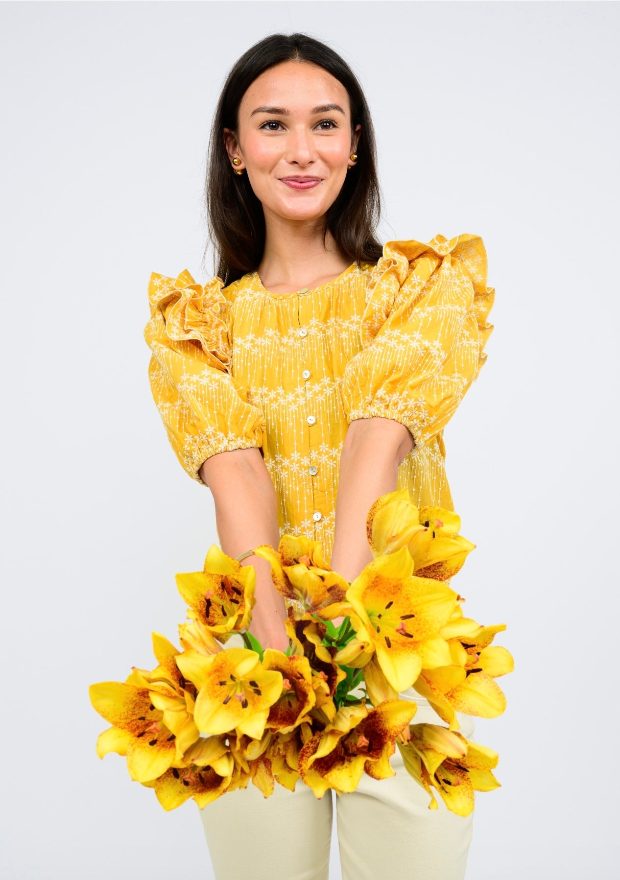 Add some fun to your wardrobe with the Daisy Eyelet Top! This playful top features a gold hue and charming ruffle sleeves, while the button-up front adds a touch of vintage flair. Perfect for any occasion, this top is sure to make a statement.