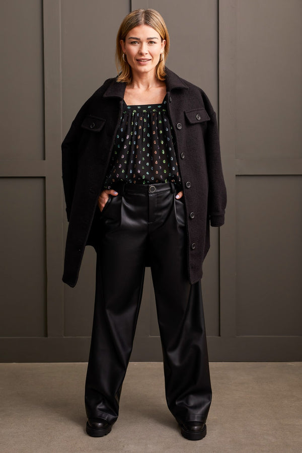 Indulge in the luxurious feel of these buttery soft faux leather trousers, the coveted statement piece your wardrobe has longed for. Crafted with a timeless button and fly closure, they boast a flattering wide-leg silhouette that ensures ample mobility and comfort. With a generous 32" inseam and convenient front slash pockets, they effortlessly combine style and functionality for an elevated ensemble.