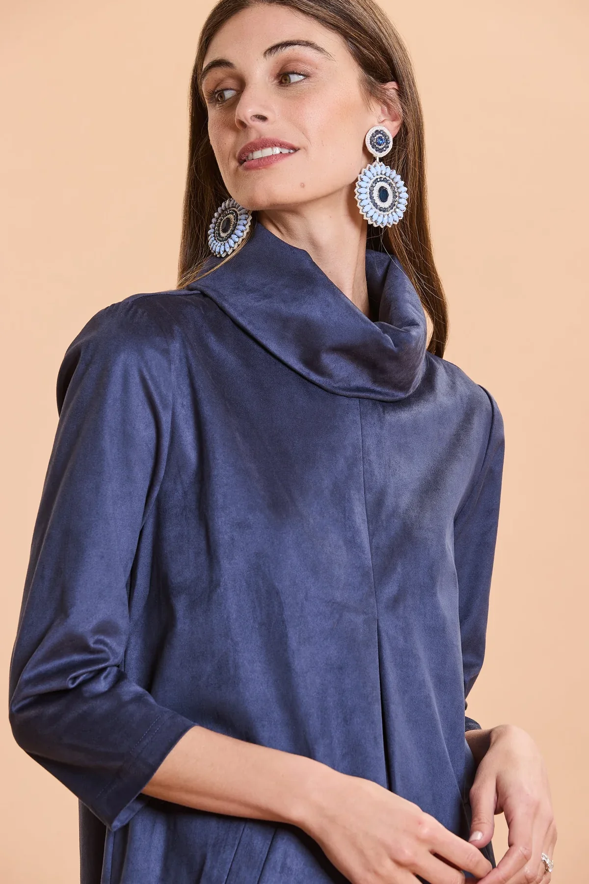 Made in an incredibly soft and breathable faux-suede fabric, this dress is the perfect combination of comfortable and chic. Dress it up with stand-out accessories for an elevated look. Cowl neck with three-quarter sleeves. Inverted front pleat. 92% Polyester, 8% Spandex. Machine wash cold, lay flat to dry. SIZE & FIT: Length: 35". Model is 5’9” and wearing a size S.