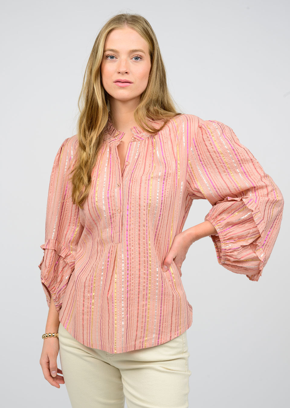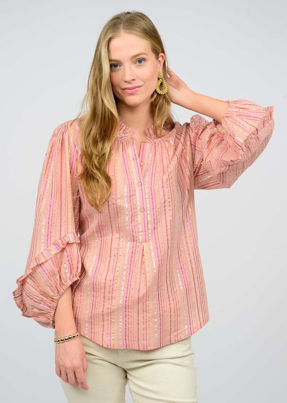 Unleash your wild side with Ivy Jane's Metallic Stripe Top. Show off your fashion sense with wide sleeves and an elastic cuff, while staying comfortable with a quarter button up front. This top is perfect for adding a touch of playfulness to any outfit.