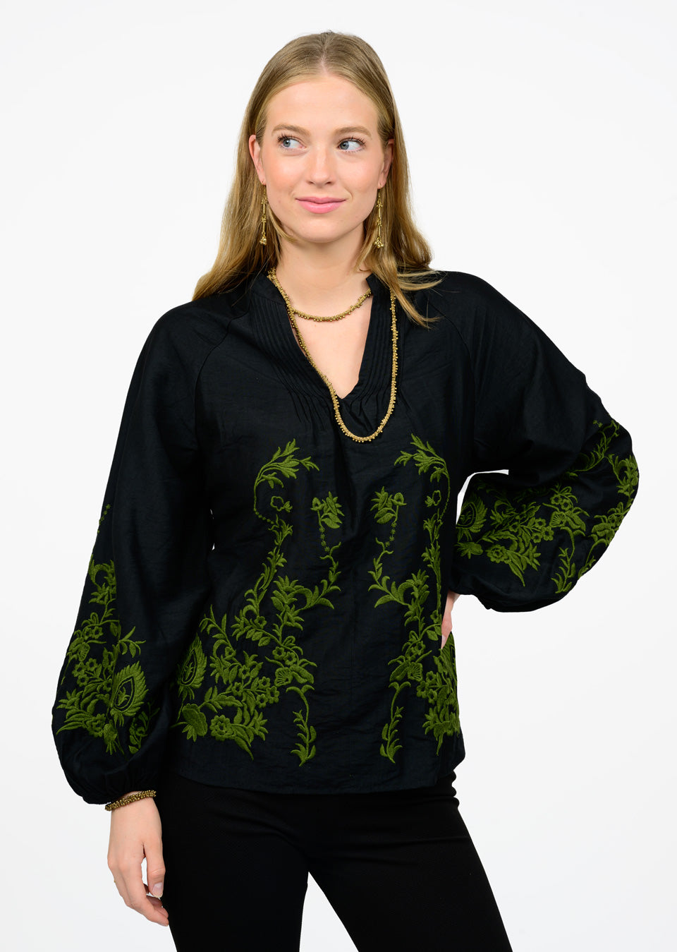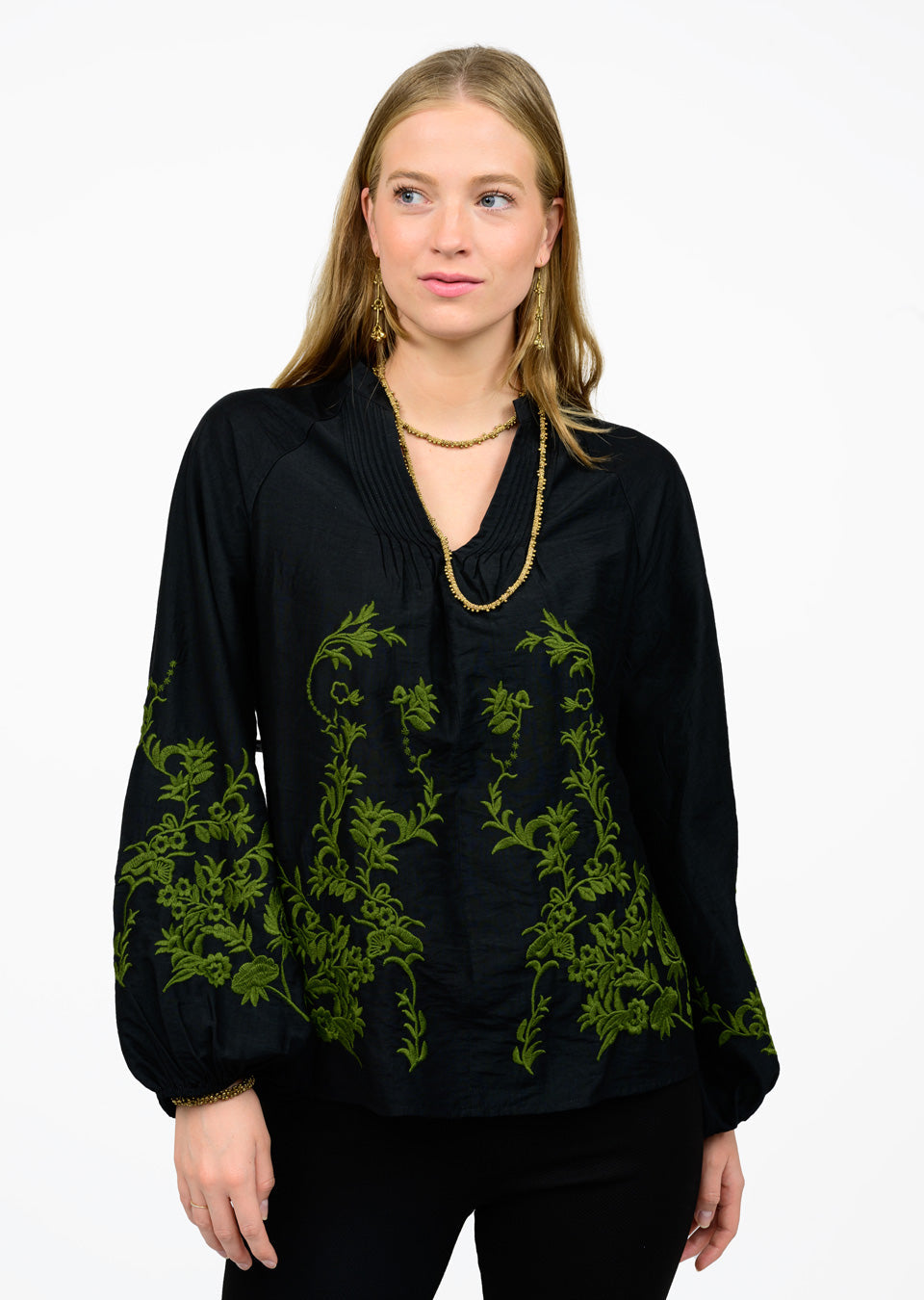 Introducing the Poet Embroidered Top by Ivy Jane. This elegant black top features elastic sleeve cuffs, wide and pleated sleeves, and delicate embroidery on both the sleeves and body. A must-have for the sophisticated and exclusive wardrobe, and perfect for any occasion.