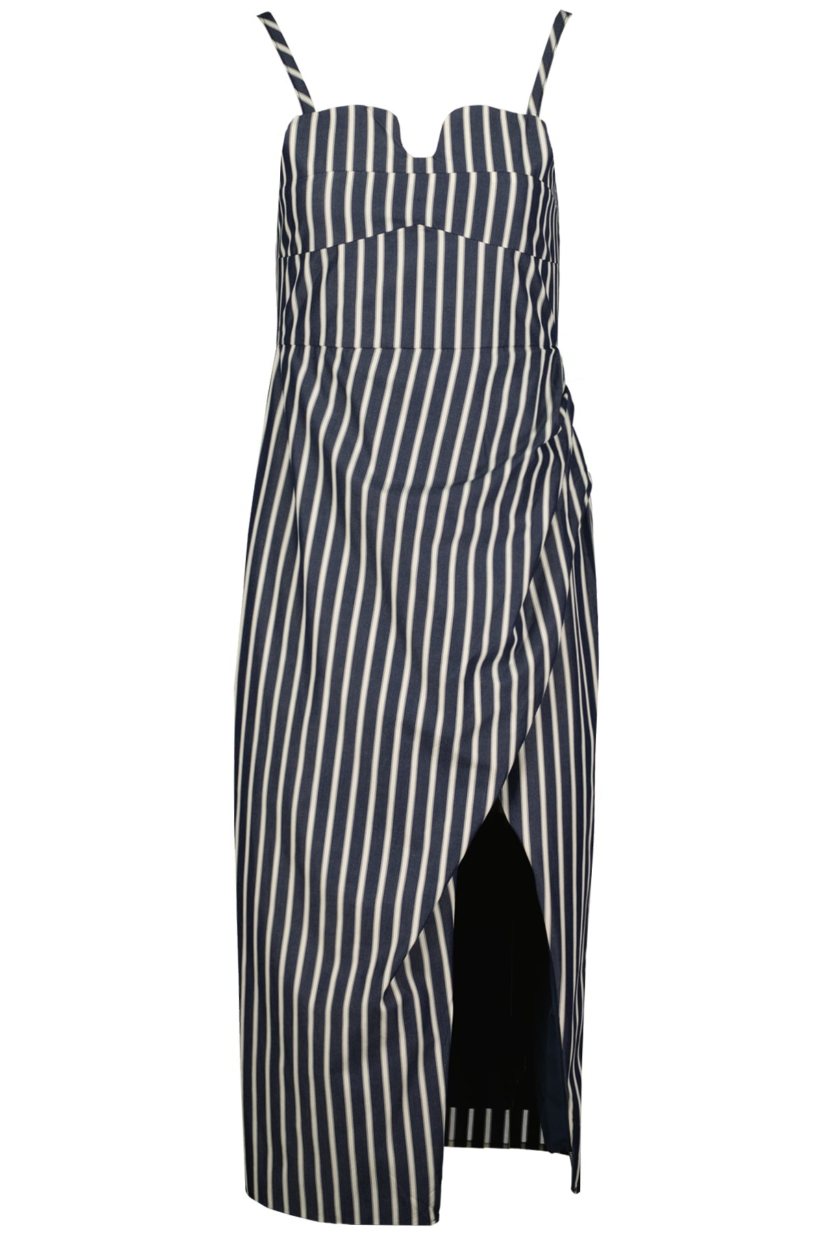 Elevate your wardrobe with the Bishop + Young Seville Corset Dress. Crafted in luxurious navy and white stripe cotton, this midi dress features flattering seaming details at the bodice and a notch front neckline for a sophisticated touch. With a front slit and true-to-size fit, it's the perfect blend of style and comfort. Model is 5'10" and wearing size S.