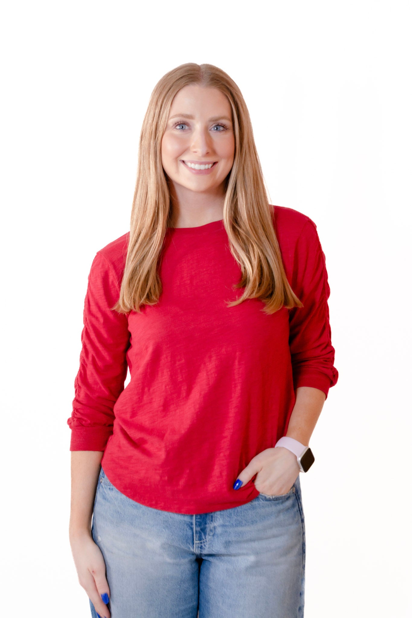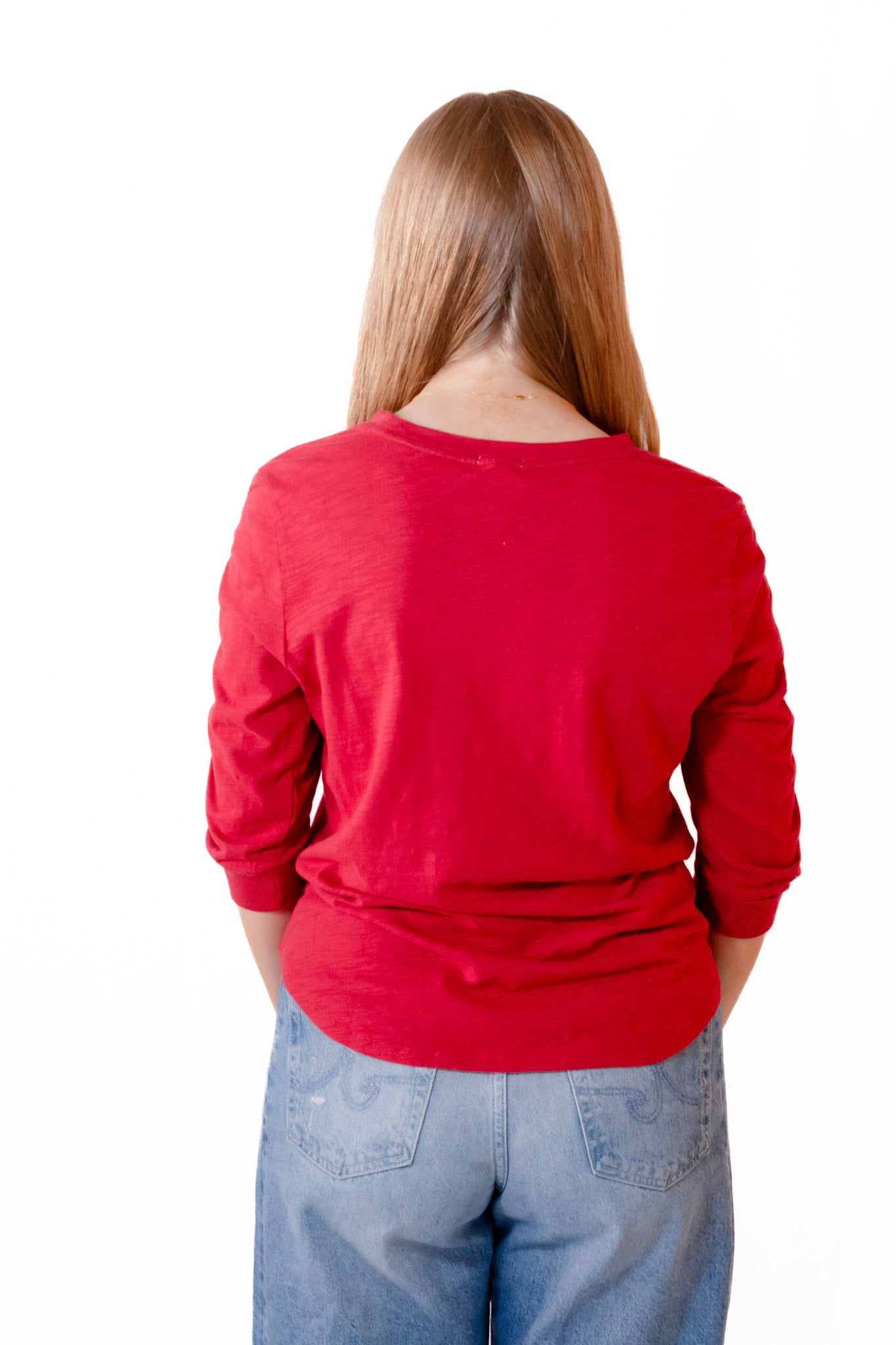 Crafted from 100% cotton, the Julia 3/4 Tee by Dylan features ruched sleeves with a ribbed band for comfort. Its vibrant red hue makes it an ideal choice for Chiefs games or festive holiday gatherings, blending comfort with understated style.