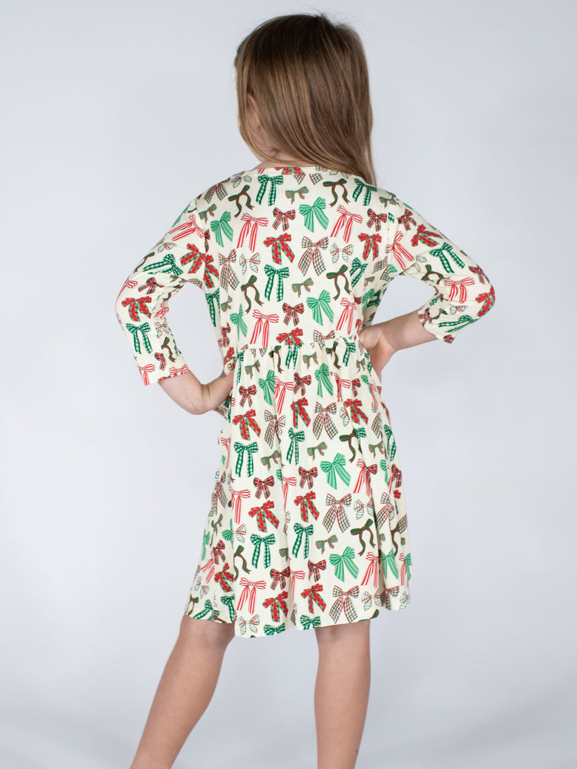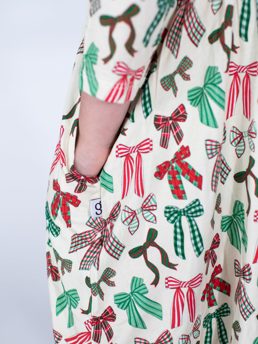 Embrace the holiday spirit in this playful 3/4 sleeve dress made from a cozy blend of 95% bamboo and 5% spandex. Featuring a festive bow pattern and handy pockets, it’s perfect for twirling through your Christmas celebrations. Easy to care for with machine wash cold on gentle and tumble dry low, this dress brings comfort and cheer all season long.