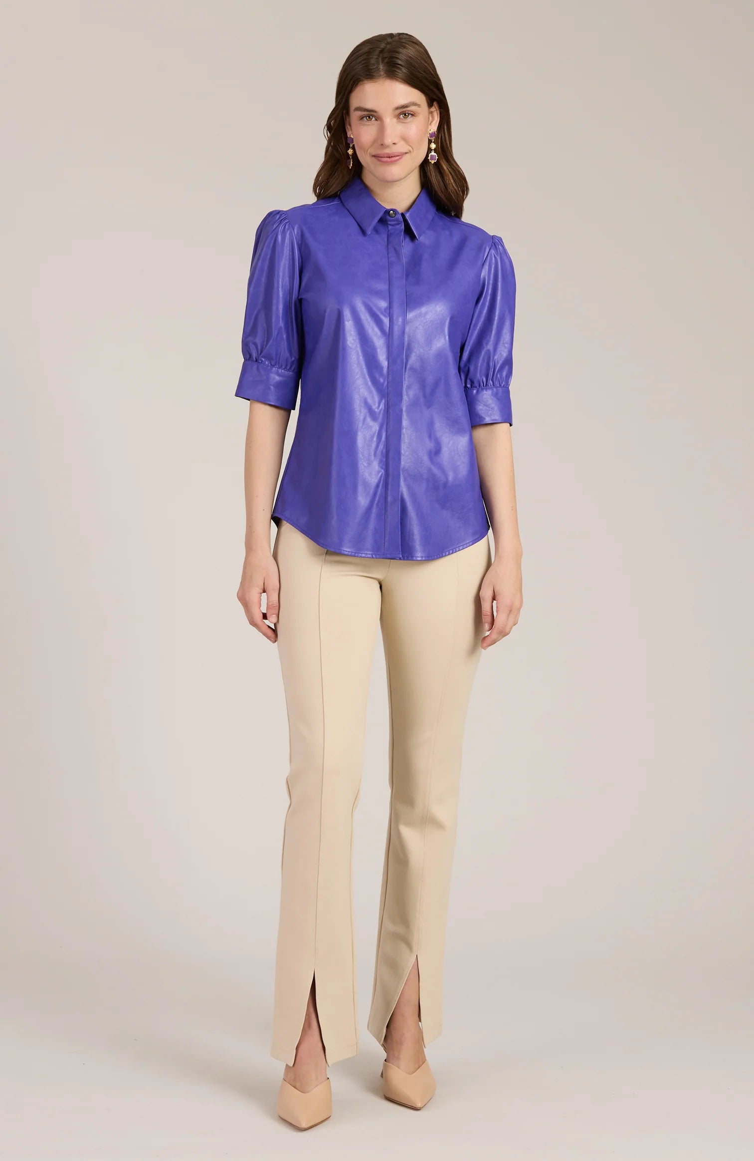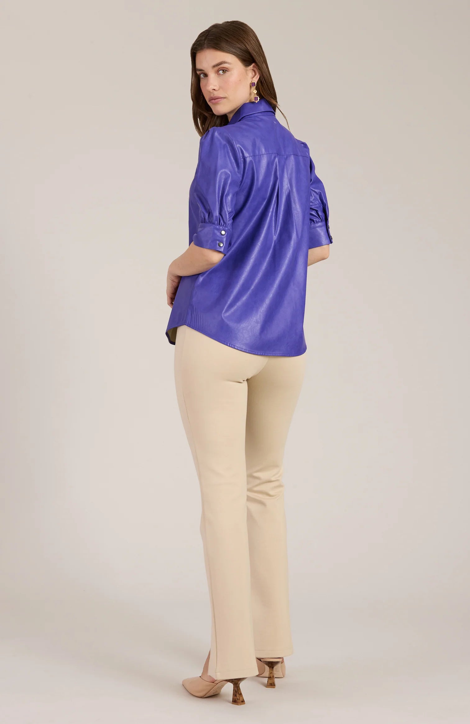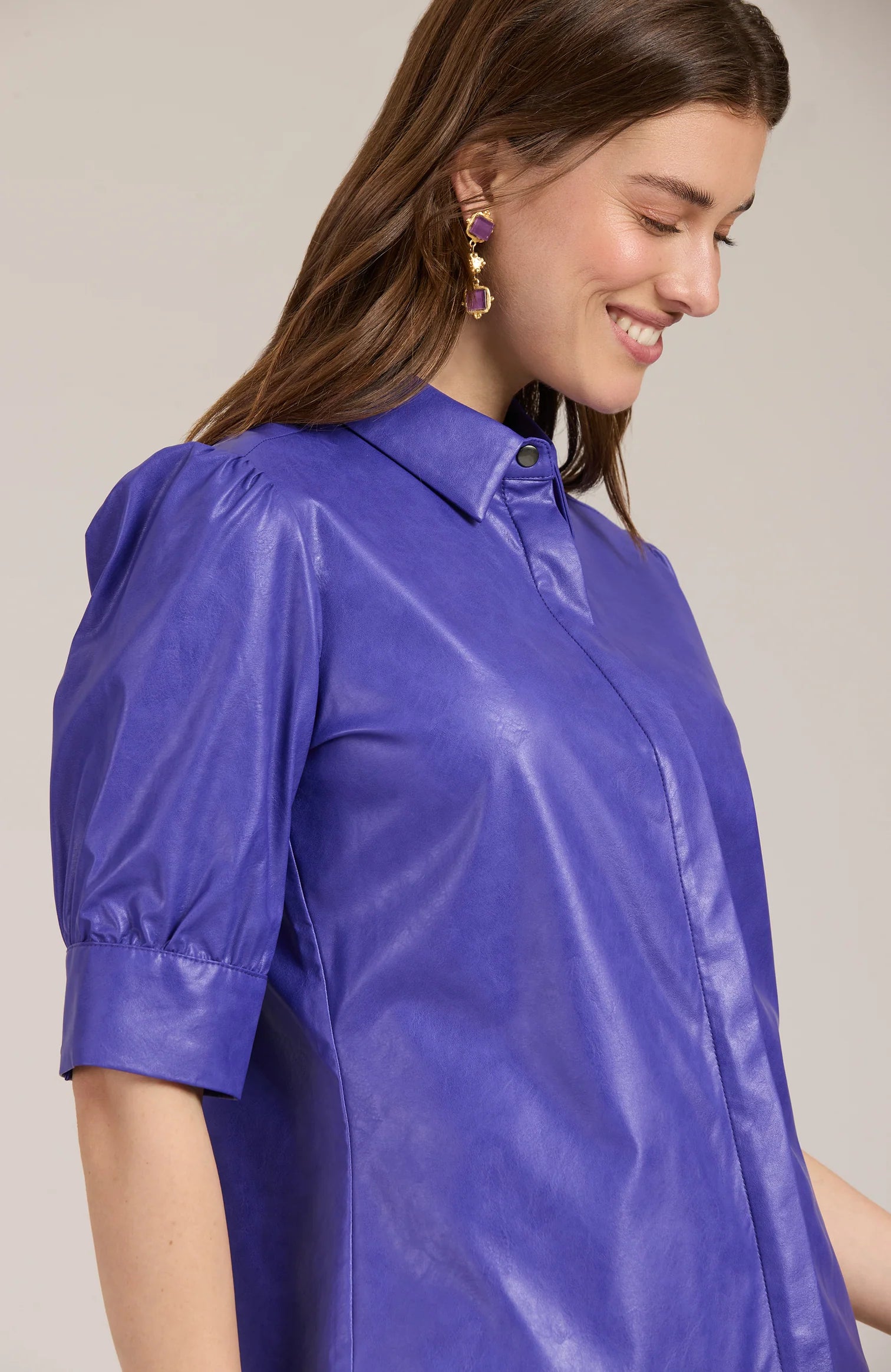 A sleek and statement-making addition to your wardrobe in buttery vegan leather. The classic shirt style balances with the edgy leather to create the perfect top to wear out to dinner, strolling around the city or to the office.