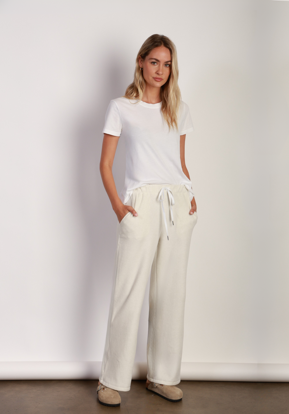 Experience ultimate comfort with the Alpine Pant by Dylan, crafted from a luxurious blend of 95% polyester and 5% spandex that offers a plush, stretch faux fur feel. This cozy wide leg pant features a white contrast drawstring, adding a subtle detail to your relaxed look. With this set in your closet you won't be able to wait for the weedend!