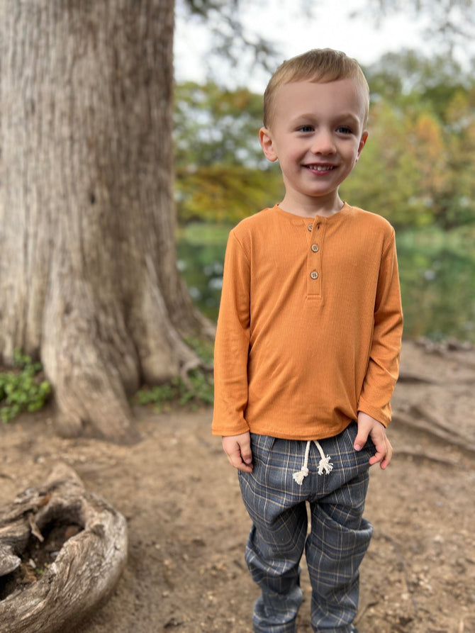 Ideal for the fall season, these grey plaid smart pants feature a classic plaid pattern, drawstring waist, and relaxed fit. Perfect for special occasions, keeping your little man comfortable and dapper.