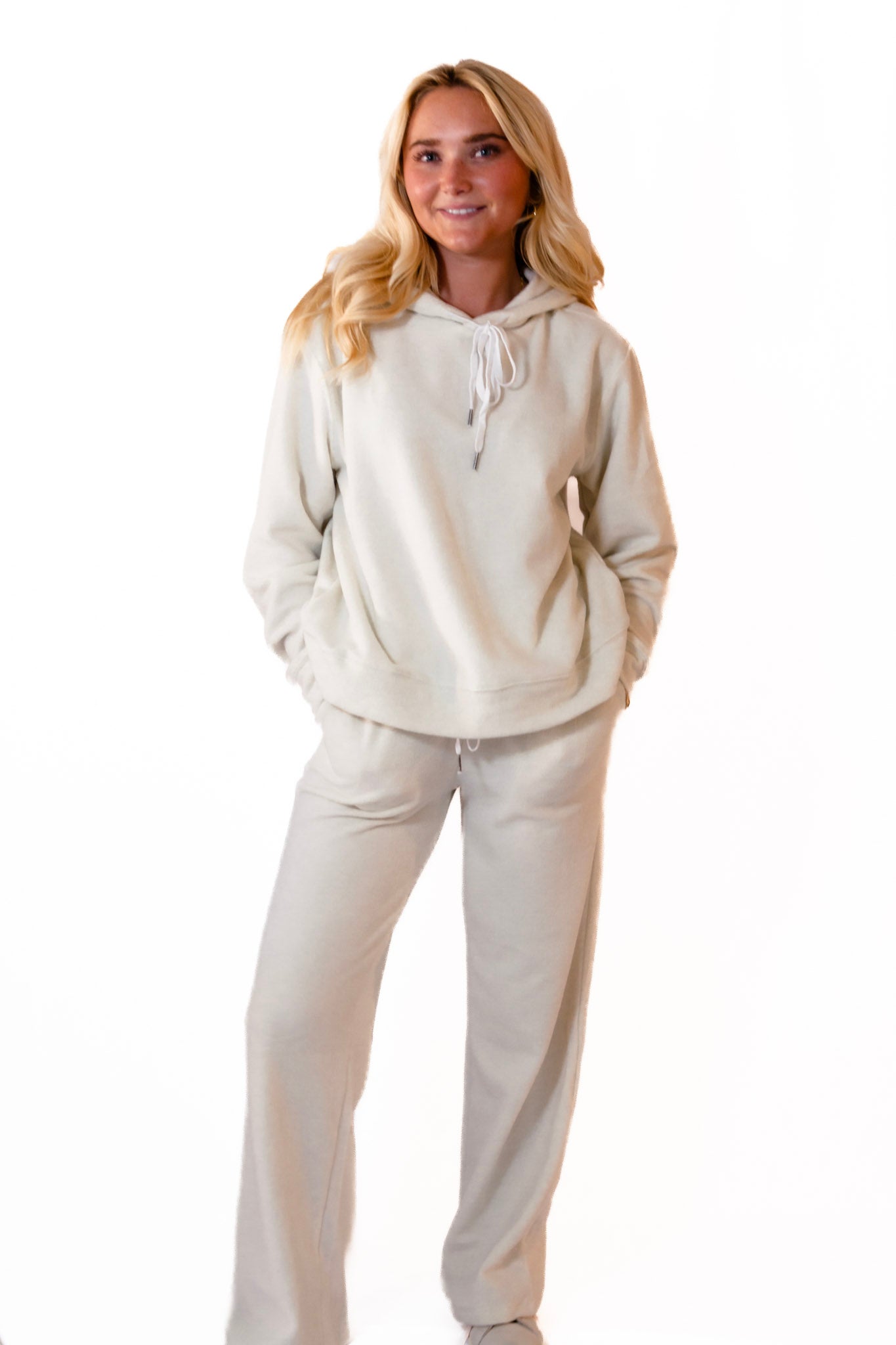 Experience ultimate comfort with the Cloud Hoodie by Dylan, crafted from a luxurious blend of 95% polyester and 5% spandex that offers a plush, stretch faux fur feel. This cozy hoodie features a white contrast drawstring, adding a subtle detail to your relaxed look. With this set in your closet you won't be able to wait for the weekend!