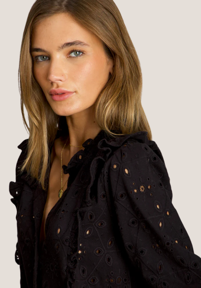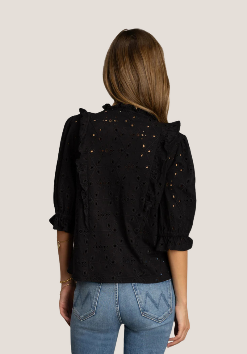 This top combine's soft cotton fabrication in a modern eyelet. Perfect for endless warm-weather looks - you can dress up or down with your fav jeans shorts. Button front style with elbow sleeves and shell buttons.
