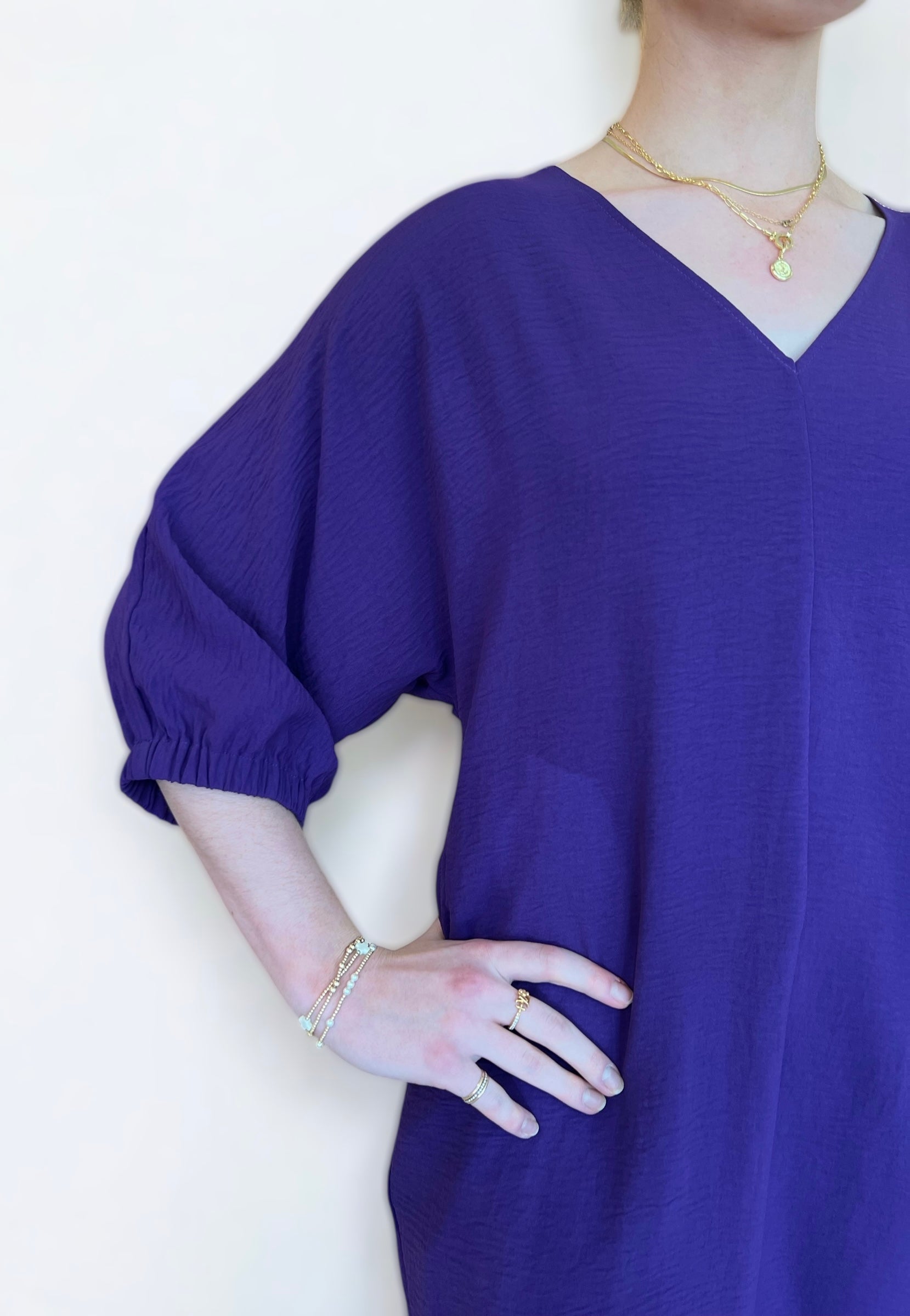 Indulge in everlasting elegance with our luxurious Dolman Elastic Sleeve V-Neck Dress by Ivy Jane. The beautiful V-neck and 3/4 elastic sleeves add a touch of sophistication, while the midi length and vibrant purple color make it a statement piece. Made from 100% polyester, this dress is perfect for any occasion.