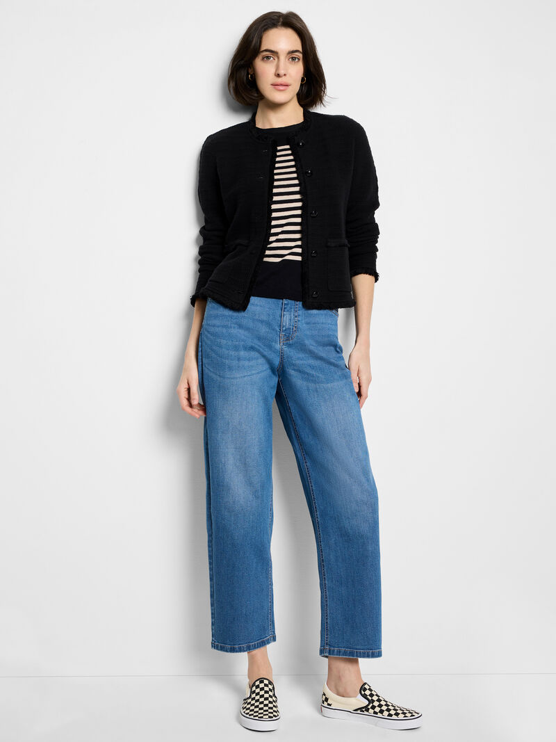 An ICO(NIC) NIC+ZOE style, the Fringe Mix Jacket, reimagined front patch pockets and a full button front. Features everything that makes the original Fringe Mix one of the greatest hits, including the fringe hem detailing and the combination of a smart, sleek silhouette with a super soft knit construction. Just as comfy as your favorite cardi, but with a little extra sophistication.
