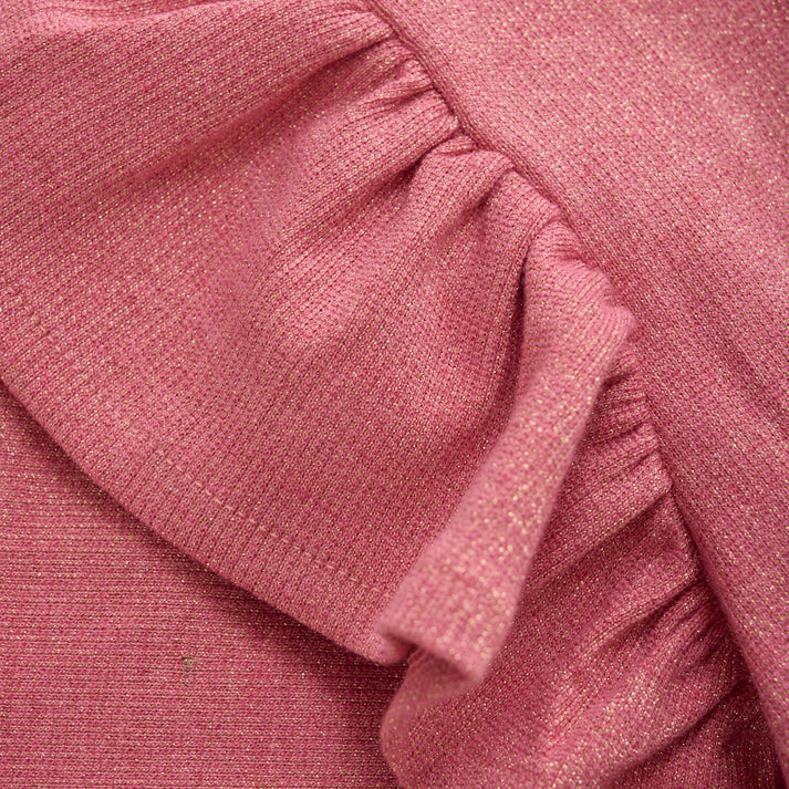 Add some sparkle to your little one's wardrobe with our Glitter Rib T-Shirt! The metallic ribbed design boasts of playful ruffle sleeves and a vibrant dark pink color, making it perfect for toddlers. Dress up or down with this fun and eye-catching top.