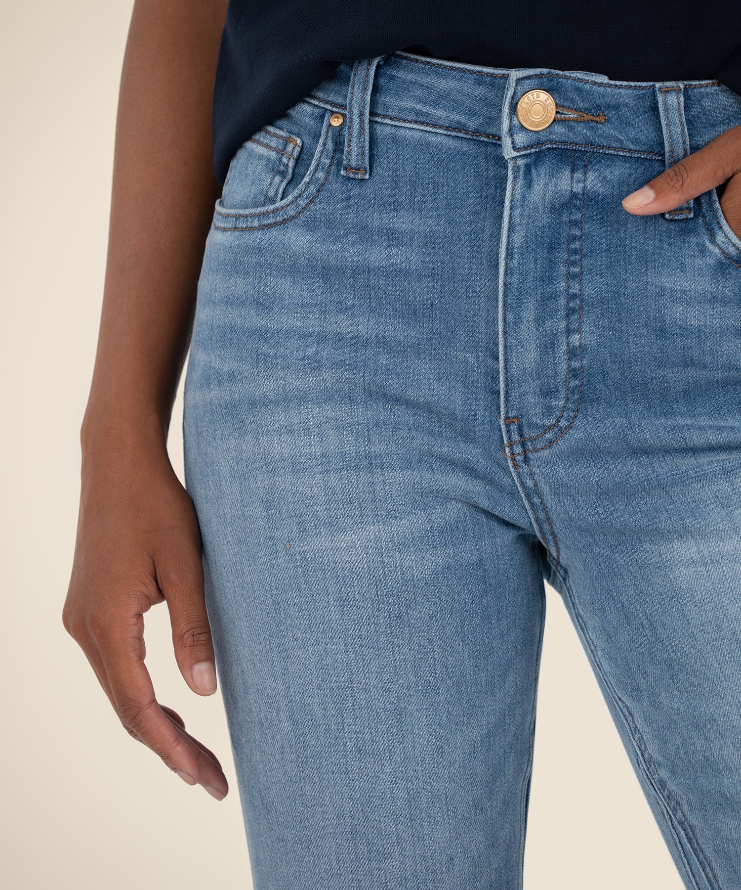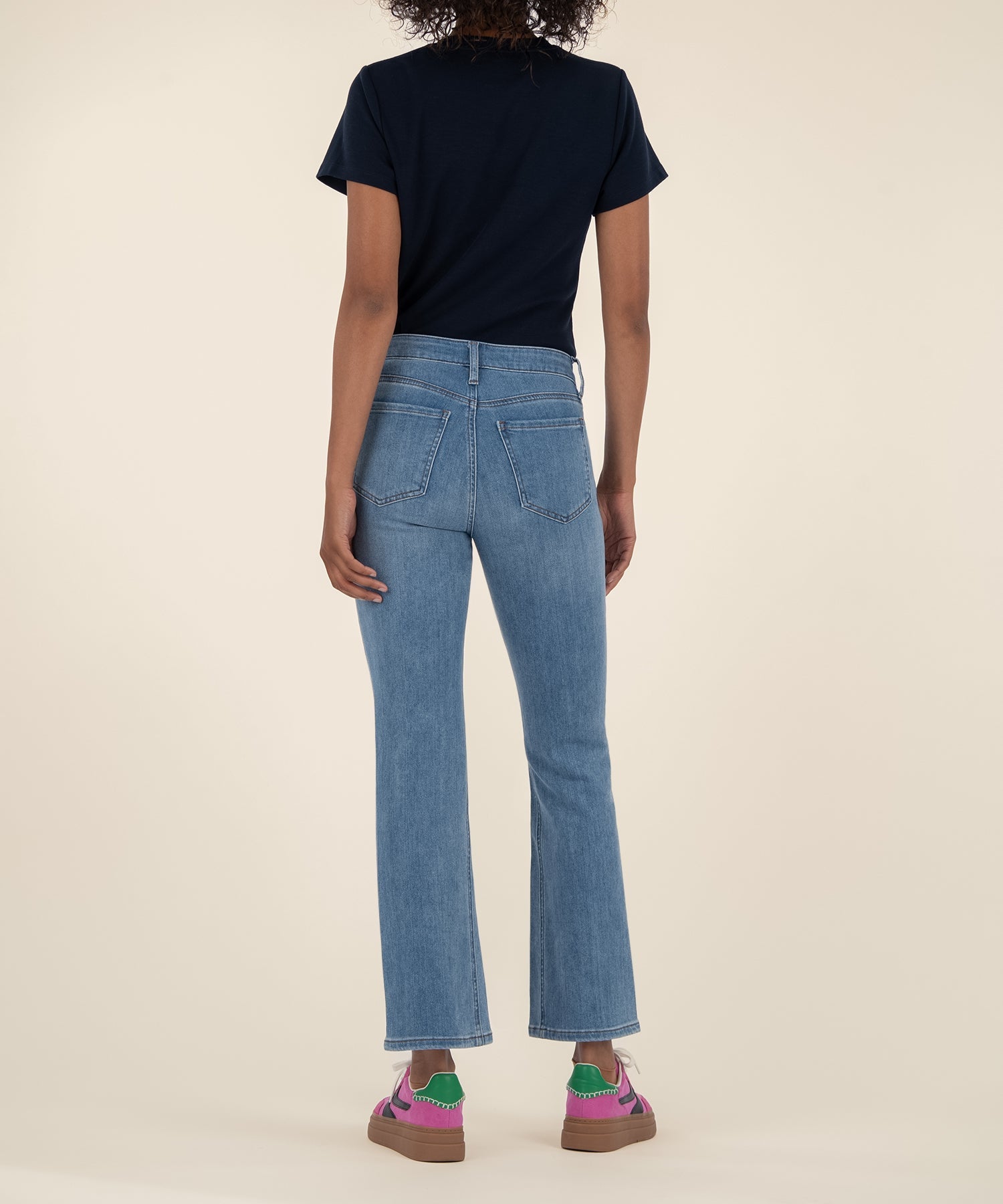 Step up your style with the Kelsey High Rise Fab Ab jeans by Kut! These ankle flare jeans hug your curves perfectly, thanks to their flattering high-rise cut and comfy stretch fabric. The classic medium wash and signature Fab Ab pockets add a fun, fresh vibe to your denim collection. Whether dressing up or down, these jeans make every outfit pop with playful confidence.