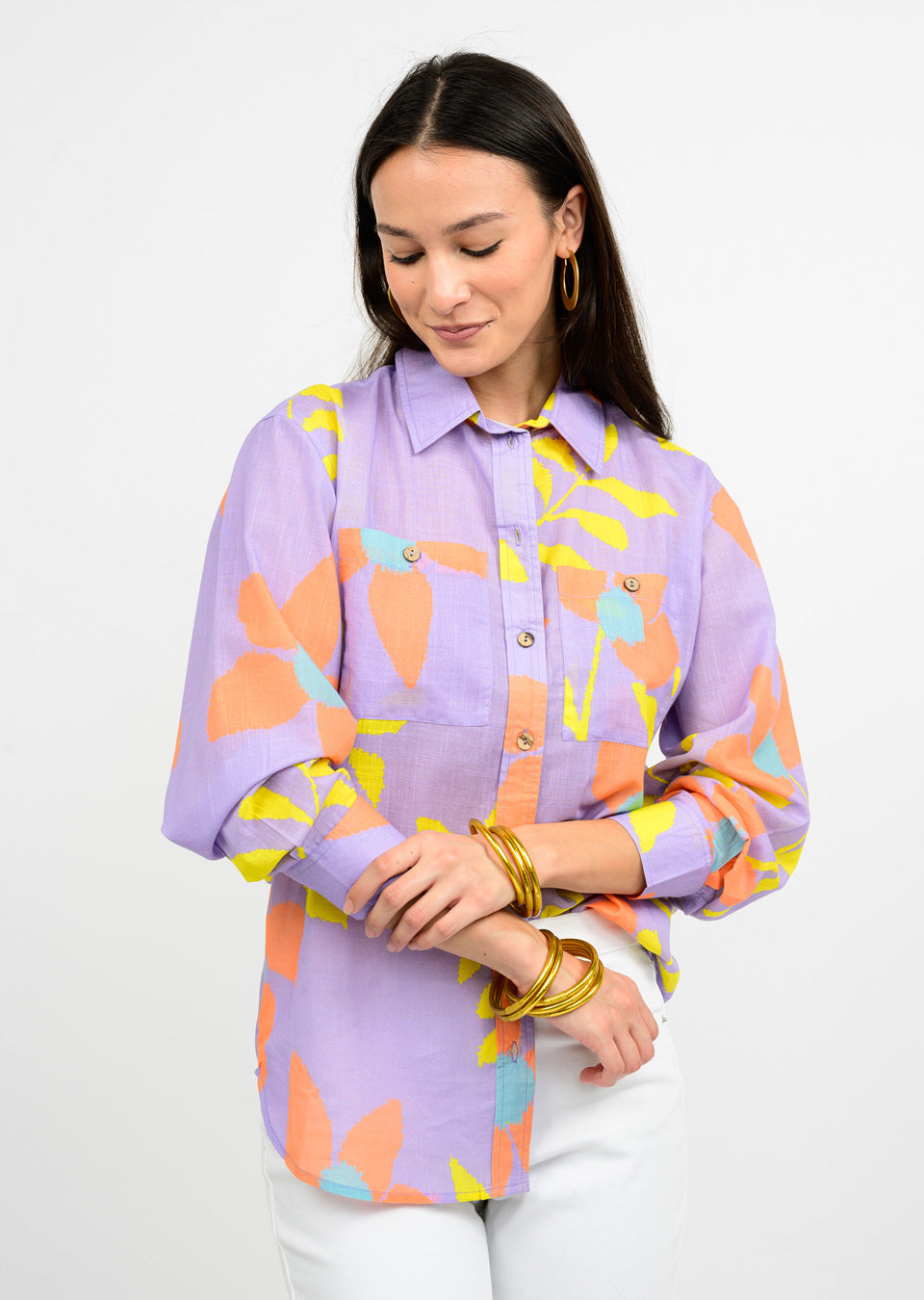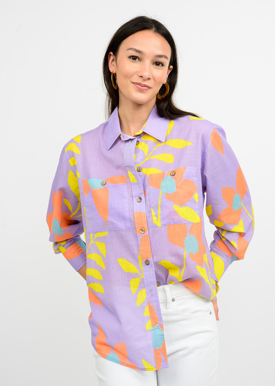 Flower power meets functionality with this Large Floral Camp Top. Featuring convenient pockets, a button-up front, button cuffs, and a classic collar, this top is the perfect blend of style and practicality. Show off your playful side with this fun and functional top. (No boring shirts here!)