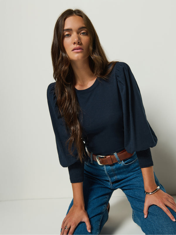 The ease of a comfortable, cotton tee meets the look of a fancy blouse. An exaggerated shoulder, volume in the 3/4 length sleeve, and smocking around the cuff create a delightfully feminine look. It's their best seller for a reason. This one comes in Night Sky.