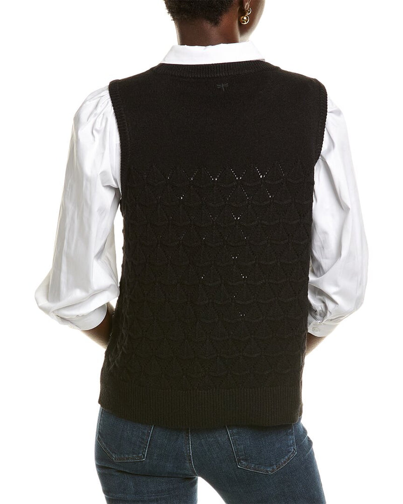Indulge in timeless elegance with Tyler Boe's Pearl Pointelle Vest. Inspired by the refined charm of upstate New York, this Black vest is tailored to elevate your everyday wardrobe. Crafted from a luxurious blend of viscose, polyester, and nylon, it drapes beautifully and is a breeze to care for. Hand wash only. Imported.