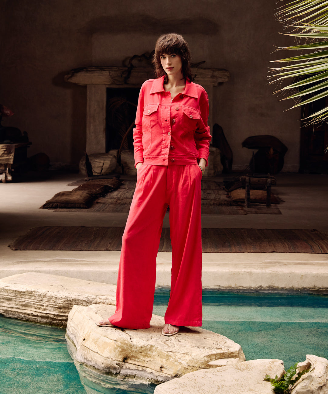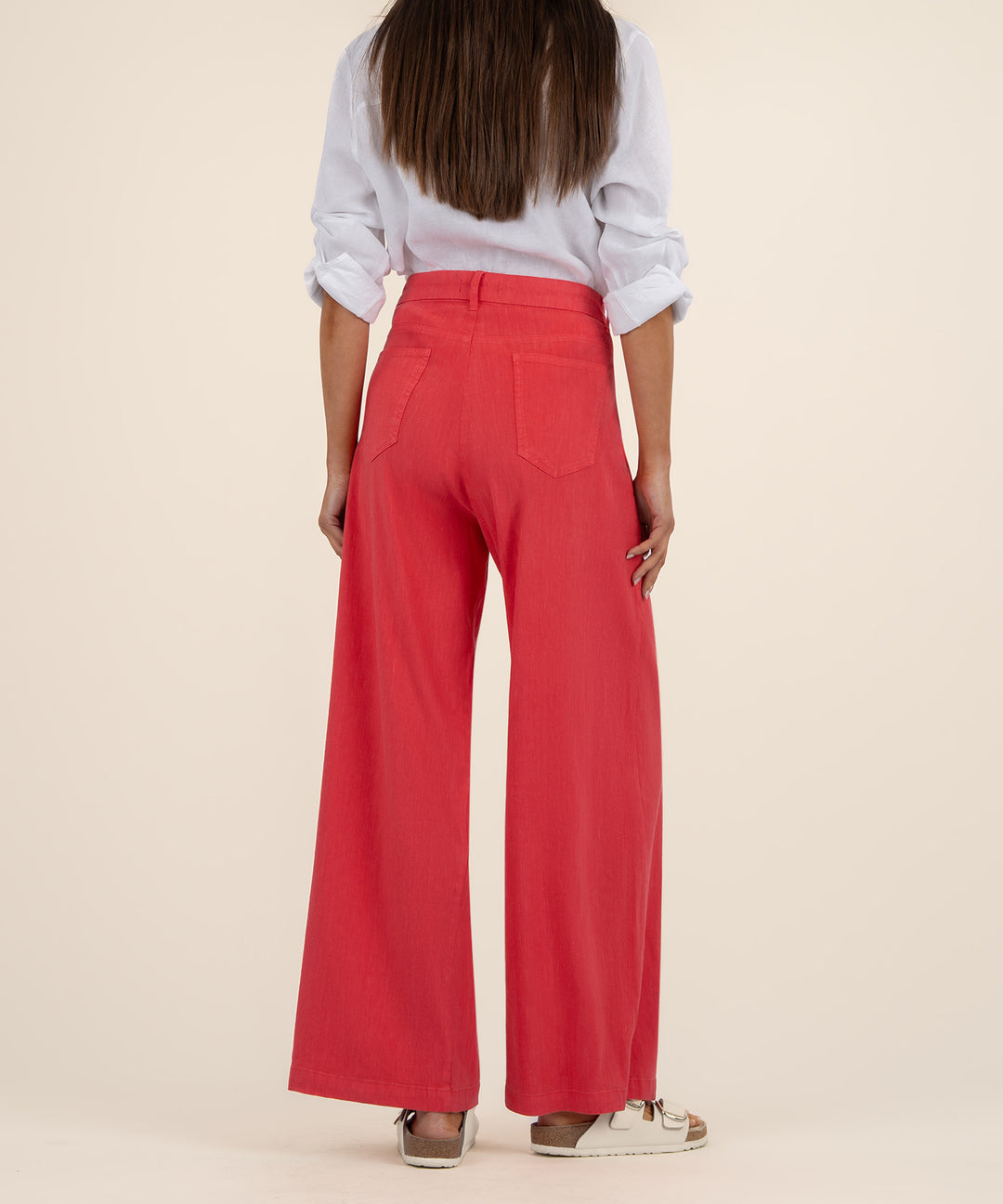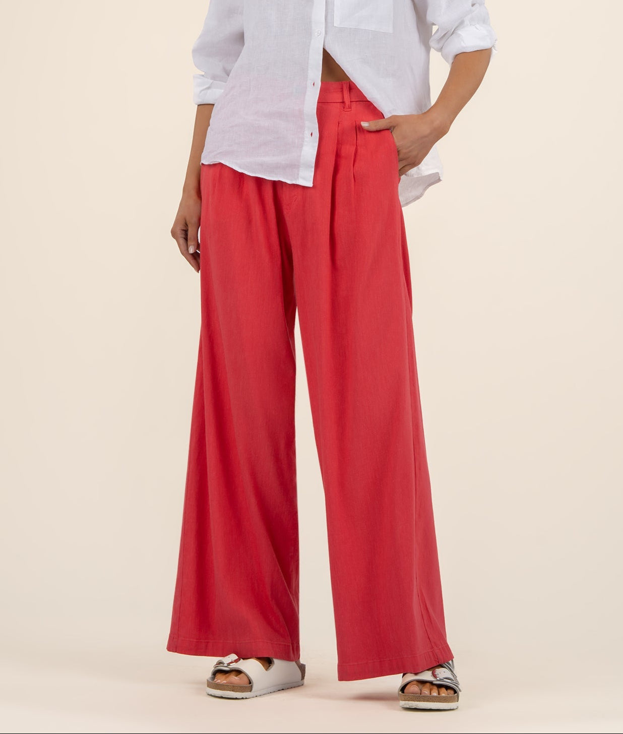 These pants are crafted from a breathable linen blend for ultimate comfort and style. The high rise fit and wide straight leg silhouette are complemented by elegant front pleats, offering a flattering and polished look. Perfect for both casual and dressed-up occasions.