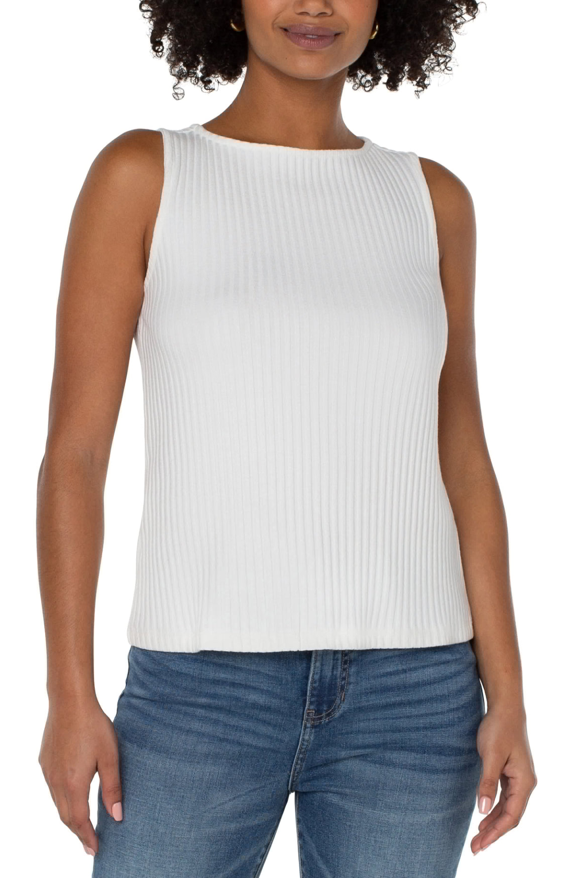 This sleeveless boat neck top, crafted by Liverpool in a Vintage White, offers a sleek and polished look. Made from 100% polyester, it ensures durability and easy care while maintaining a smooth, comfortable fit. Ideal for layering or wearing alone, this top combines classic style with practical fabric performance.
