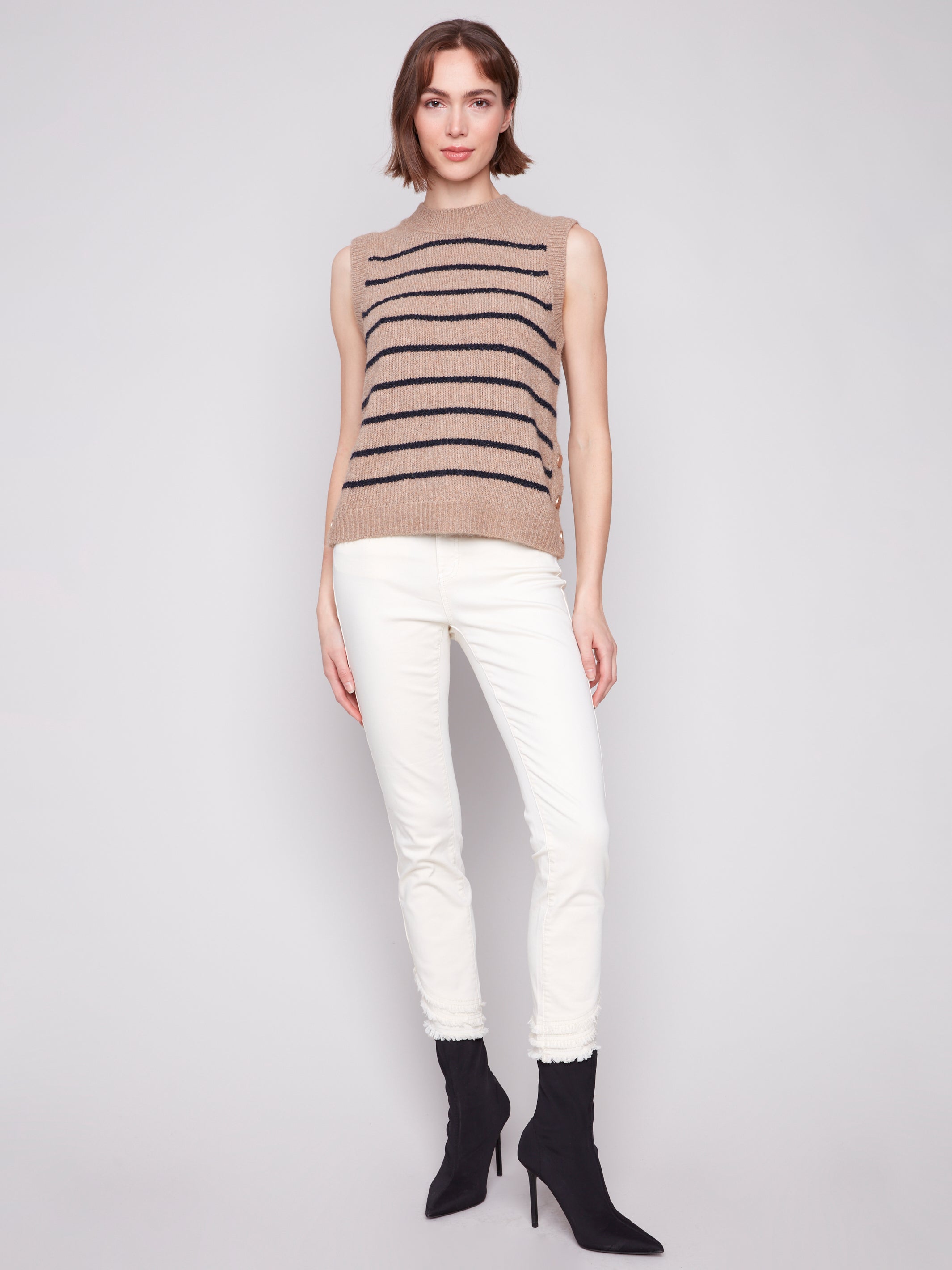 This sleeveless V-neck sweater vest by Charlie B brings a playful twist with its vibrant stripes and charming button details along the side. Perfect for layering or wearing on its own, it adds a fun and stylish flair to any outfit.