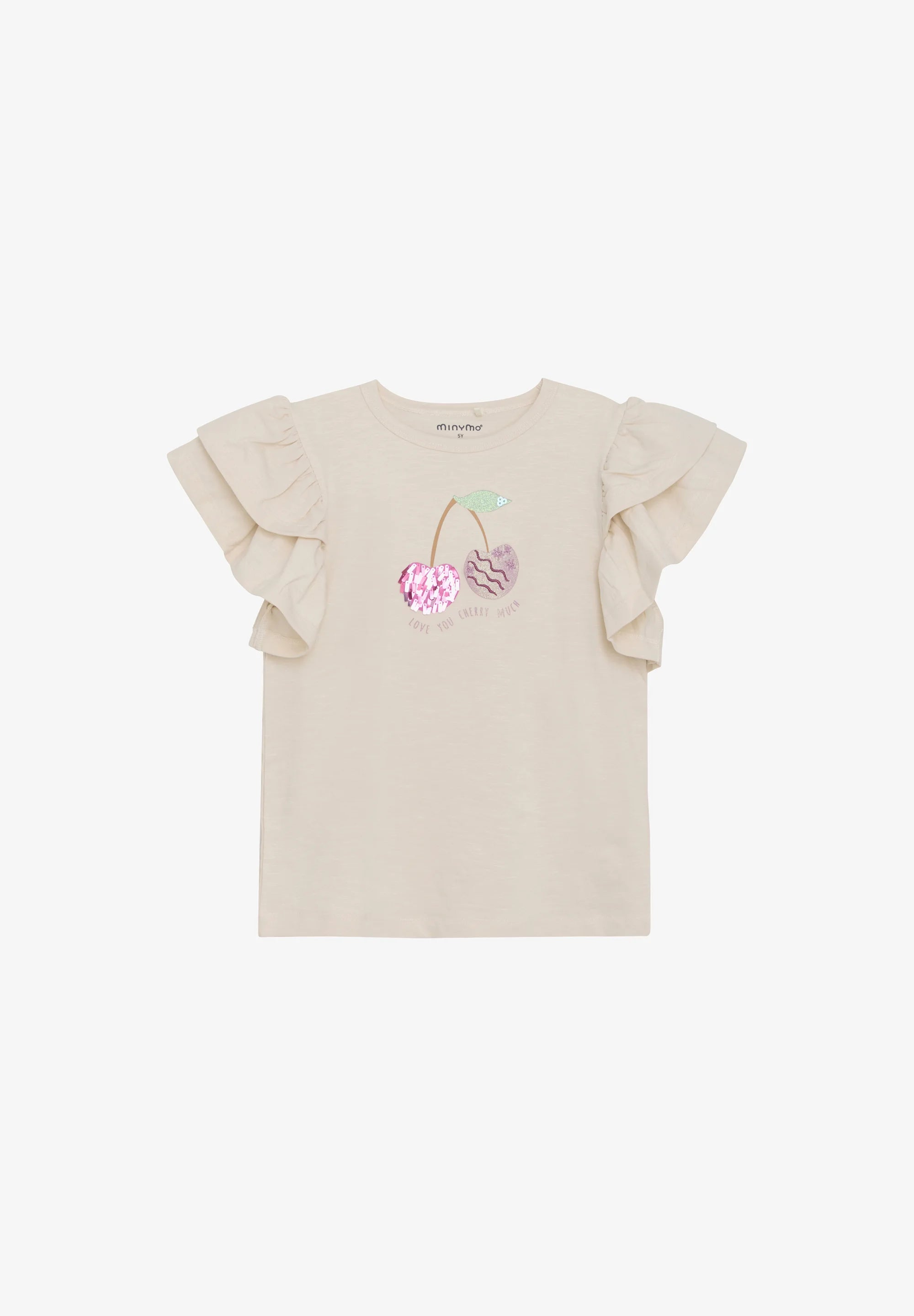 This playful short-sleeve T-shirt brings charm to everyday wear with its cute cherry motif on the chest. Made from a soft and stretchy cotton-elastane blend, it offers comfort and ease of movement. The delicate frill sleeves add a sweet, feminine flair.