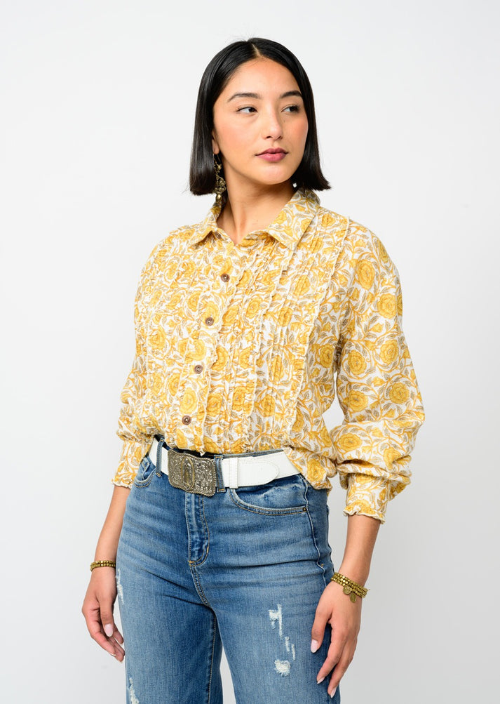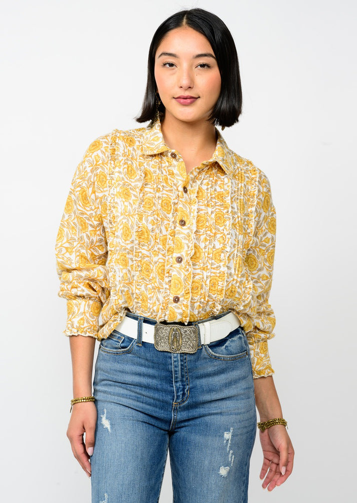 This Tuxedo Gauze Top by Ivy Jane combines timeless elegance with comfort. Made from 100% cotton in a rich gold hue, it features a button-down front, a classic collared neck, and long sleeves. The subtle floral design adds a refined detail, while the breathable gauze fabric ensures all-day wearability, perfect for sophisticated, effortless style.