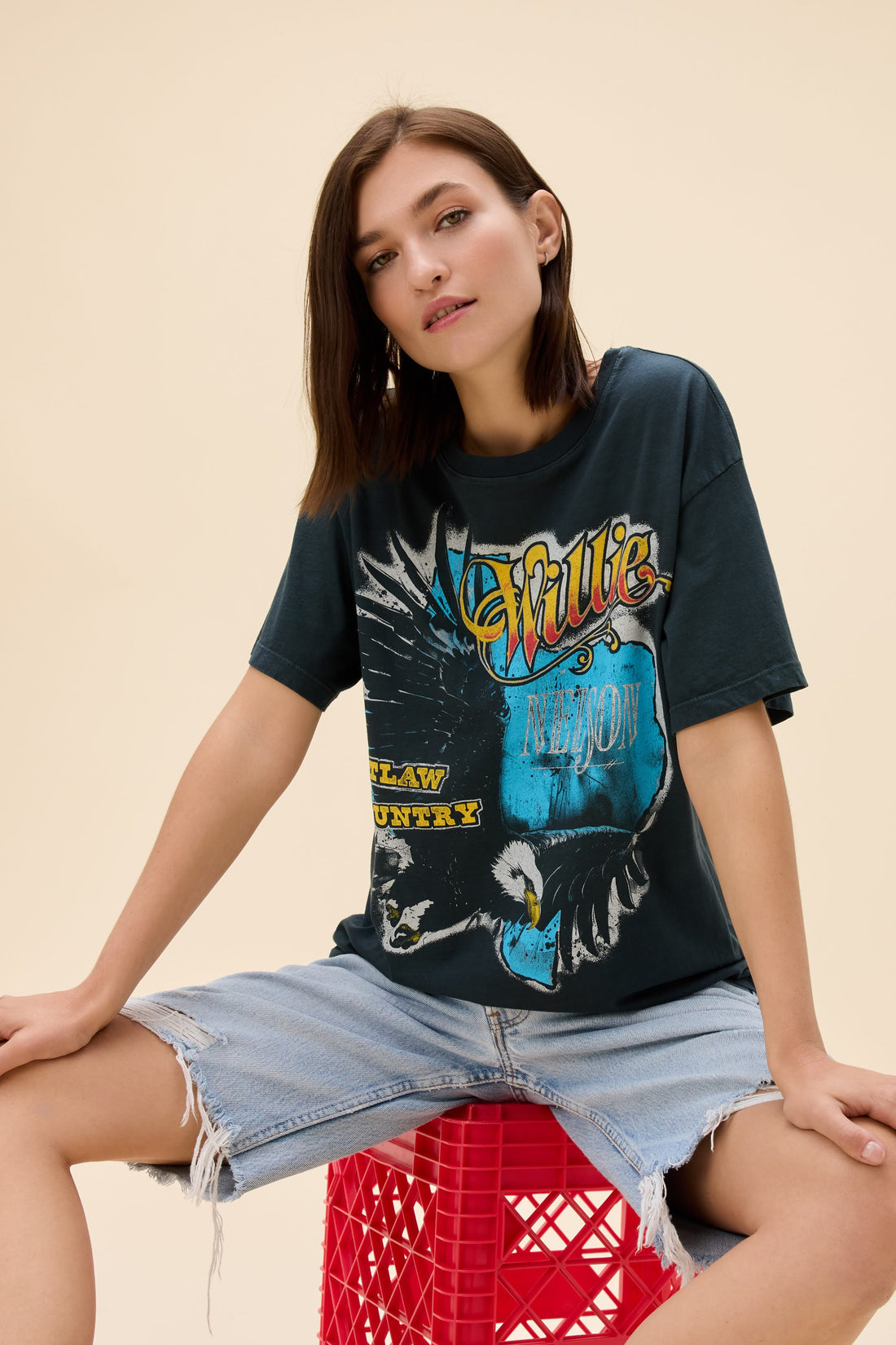 Nailing the essence of Willie Nelson's western roots and the outlaw genre he pioneered, an eagle and Texas state graphic hits center chest fit to represent the name who still dominates all conversations about country sound.